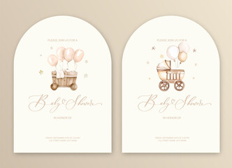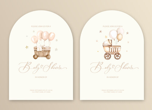 Cute baby shower watercolor invitation card for baby and kids new born celebration with baby carriage.