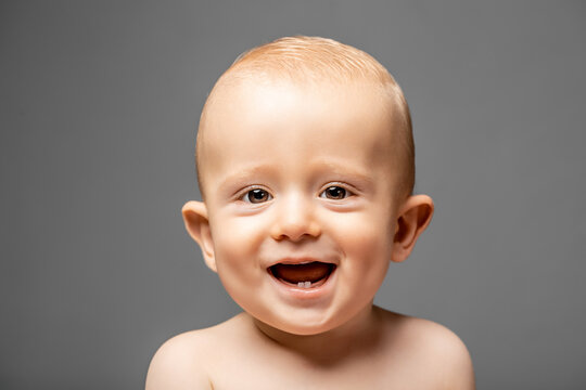 Happy baby infant with first tooth, close-up portrait. Looking at camera. concept of caring for baby teeth, dental care