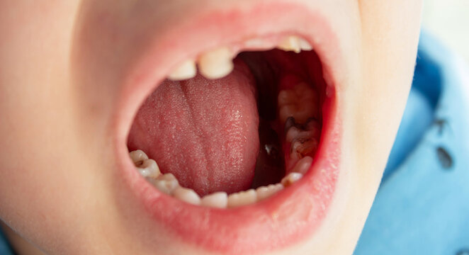 Tooth decay of children who like to eat sweets candy. And doesn't like brushing teeth