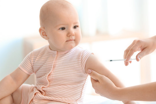 Pediatrician administring vaccination to little baby.  Pediatrician is giving injection in leg to small baby. Close up. Children health care and disease prevention.