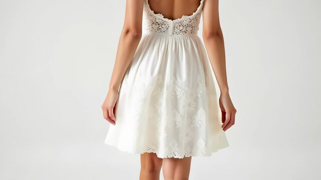 Stunning 4K slow motion footage of a lace babydoll dress with a low back flowing gracefully against a white background showcasing intricate details and movement.