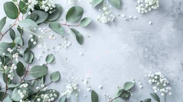 Top view of eucalyptus leaves and white flowers on a light gray stone background. Flat lay, copy space.