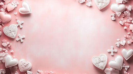 Pair of small pink baby socks, cookies, gift box on pink background with copy space for your warm message, baby shower, first newborn party background, copy space, monochrome, banner