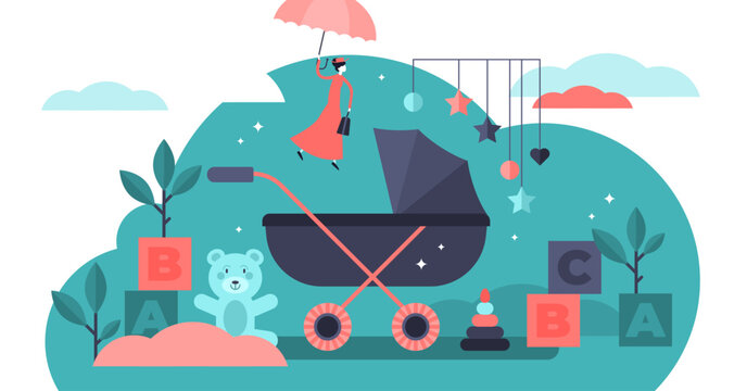 Babysitter illustration, transparent background. Flat tiny children nursery persons concept. Newborn toddler care and nanny occupation. Educational profession work with infant toys.