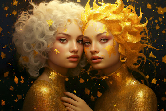 Zodiac sign of Gemini, two sexy young women on gold confetti bac