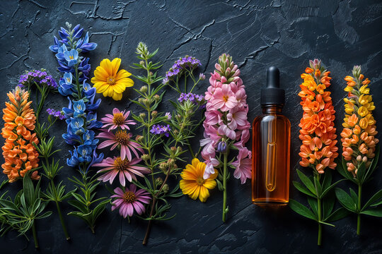 Glass dropper bottle amidst an array of vibrant bach flower blooms on a textured background