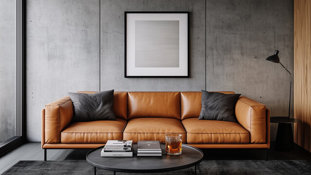 In a dark, gloomy room with a large plant and a carpet, there are poster frames and a solitary sofa. For poster frames, use a black backdrop. Generative AI