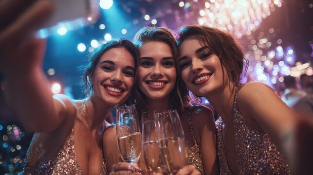celebration friends bachelorette party technology and holidays concept  happy women with champagne and smartphone selfie stick taking picture at night club no logos no brands ar 169