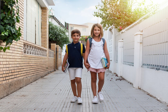 Two happy brothers holding hands with their backpacks and books returning from their first day of school. Back to school