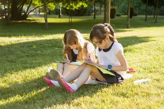 Two little girl friends schoolgirl learns sitting on a meadow in the park. Children with backpacks, books, notebooks. View from the back