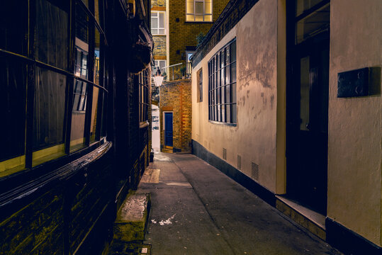 A mysterious and hidden old back alley in London at night