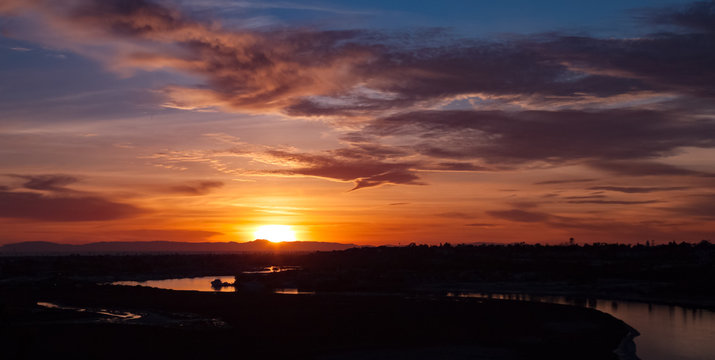 sun setting behind Catalina Island viewed from Newport Beach back bay in California