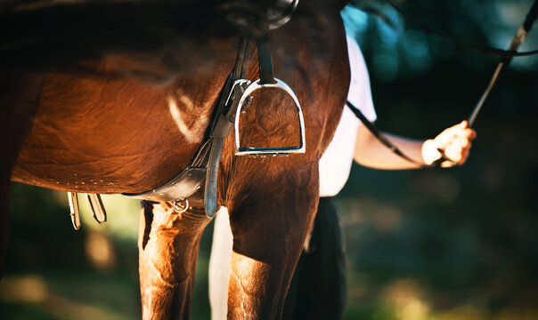 A rear view of a bay horse, which is wearing a stirrup, which waved its dark tail. And next to it is a horse breeder who holds a horse by the bridle rein on a sunny summer day. Equestrian sports.