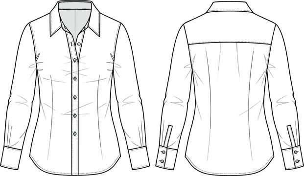 Button-up shirt technical sketch, front and back view, collared neckline, button placket, cuffed sleeves, back yoke with darts, fashion drawing, garment design template