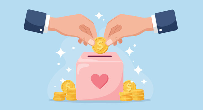 Hands placing coins in heart-emblazoned piggy bank with sparkling back