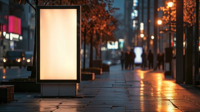Blank city format banner pylon on the sidewalk mockup. Billboard in the city center mock up. Blurred background, focus on foreground, copy space