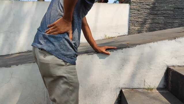 Man experiencing lower back pain holds lower back. Painful area highlighted. Medical health concern injury. Possible need for treatment, therapy, chiropractic care. Image ideal for healthcare