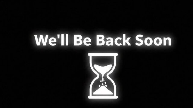 We’ll Be Back Soon Message with Hourglass Icon on Black Background – Website Maintenance, Service Downtime, Technical Update, or Streaming Pause Screen Animation