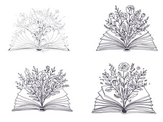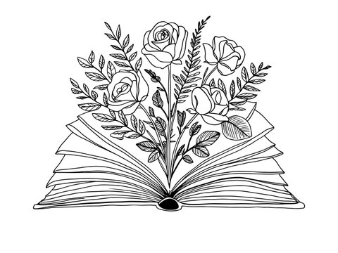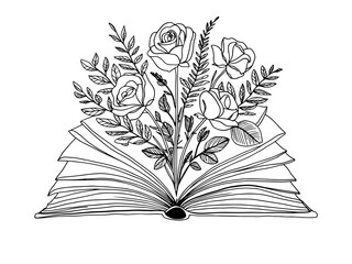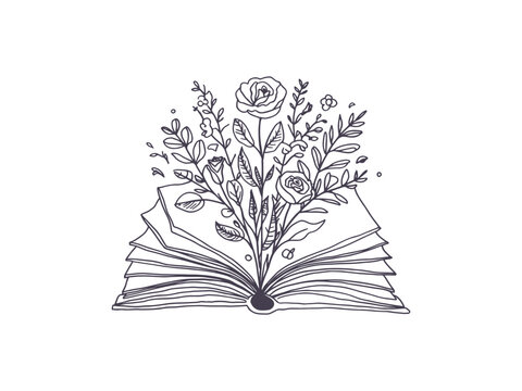Line Art open book with flowers and roses emerging from اts pages