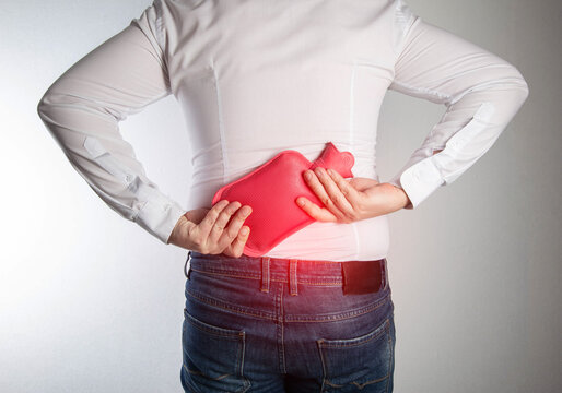 A man holds a medical heating pad with hot water in the lumbar spine. Relaxation of the back muscles with back pain, lumbago. Pinched nerve, close-up