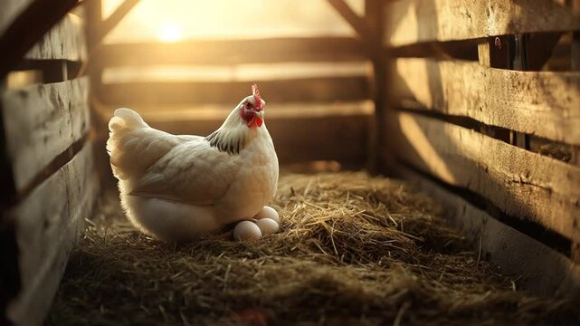 Hen protecting her eggs in rustic wooden coop with warm morning sunlight, farm life