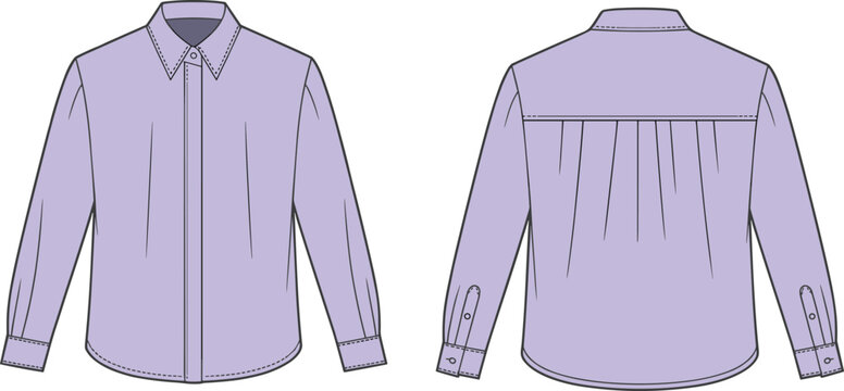 Button-up shirt technical sketch, front and back view, collared neckline, button placket, cuffed sleeves, back yoke with darts, fashion drawing, garment design template