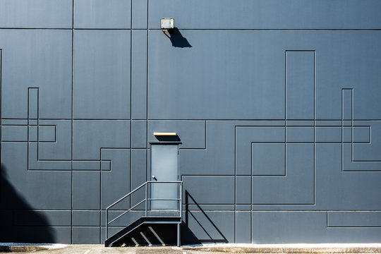 Clean geometric shapes of industrial architecture - back door entrance into warehouse building