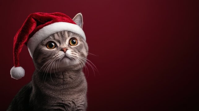 Portrait of a stately Scottish Fold Cat in a classic red Christmas hat, placed against a deep burgundy studio backdrop with elegant lighting, copy space, Scottish Fold Christmas hat, holiday cat