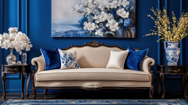 A stately Victorian-style camelback sofa in soft taupe against a deep sapphire blue backdrop
