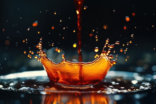 A high-speed capture of red wine being poured into a glass, with droplets splashing against a dark backdrop.