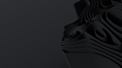 Black 3D Ribbons arranged to create a Dark abstract wallpaper. 3D Render with copy-space.