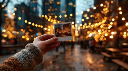 A hand holds a polaroid photo amidst a backdrop of vibrant bokeh lights, highlighting the joy of memories and moments captured during festive occasions in urban settings.