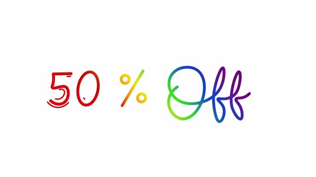 50% offer One line continuous animated typography intro outro, hand drawn calligraphy monoline vintage text on background, sale animated Calligraphy lettering video rainbow type on white backdrop bg