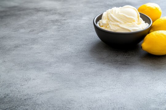 Fresh lemon ice cream sits in a bowl beside whole lemons, highlighting the citrusy flavor of the dessert against a light, neutral backdrop