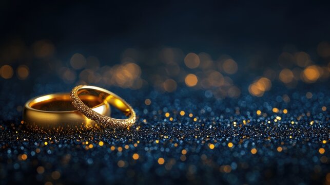 Elegant golden wedding rings resting on a shimmering blue backdrop, surrounded by sparkling particles that enhance their luxurious appearance.
