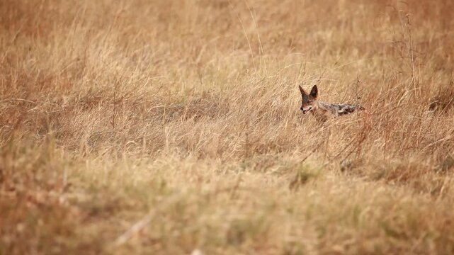 Black backed jackal barking a warning signal in the golden African grassland