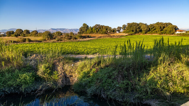 Vibrant green peanut field carpet with river reflection and reed beds, backed by forest and hazy rocky mountains under warm evening sun. Sorgun, Antalya, Turkey.