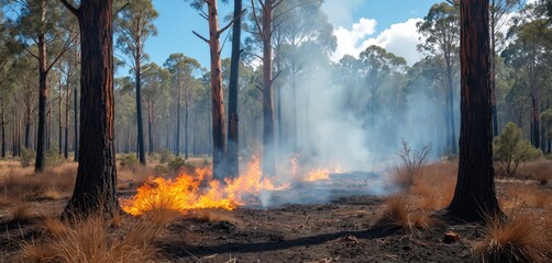 Controlled forest burn manages vegetation, reduces wildfire hazard using backfire techniques. Smoke billows through trees, showing land management, ecological restoration efforts. Practice supports