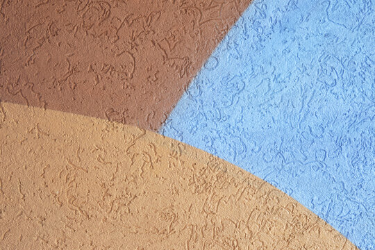 Tricolor three colors modern wall in blue, brown and beige. Lovely plastered walls backgounds backdrop concept