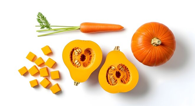 Overhead shot of fresh butternut squash carrot and pumpkin healthy food ingredients on white backgro