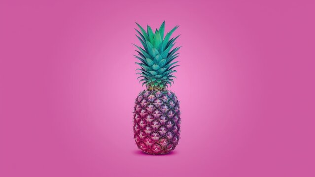 Pinkglow pineapple. Purple pineapple with green leaves on pink backgro