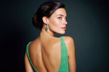 Profile portrait of an elegant  girl wearing a backless dress. I