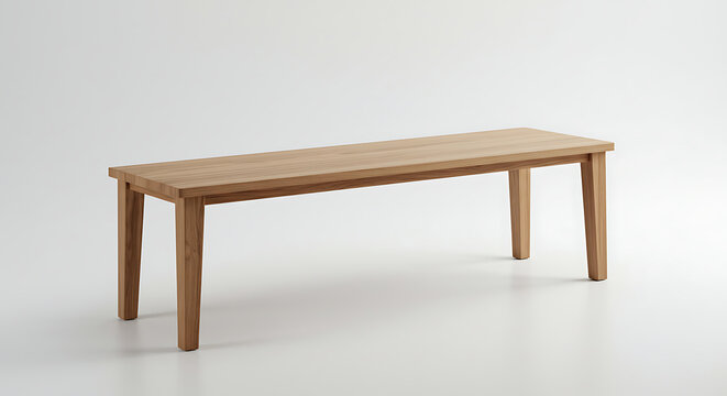 A minimalist long rectangular wooden bench with a natural light brown finish and four simple sturdy legs.