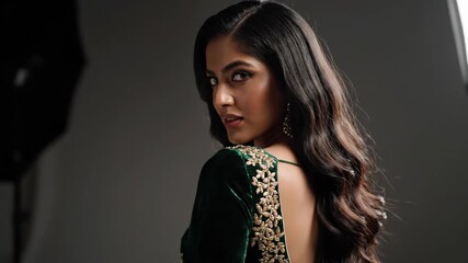 Elegant asian woman in embroidered green velvet dress poses in side profile. Flowing dark hair and subtle expressions capture fashion essence. Cinematic medium shot of poised model turning head.