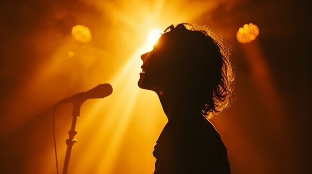 A passionate music artist pours their heart into the microphone under the warm backlighting of the sun, captivating the audience at their concert with their soulful singing