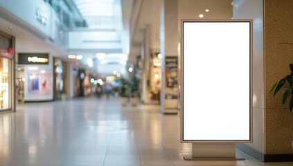 Blank Advertising Sign in Modern Shopping Mall Interior, Ideal for Business Promotion and Marketing Displays.