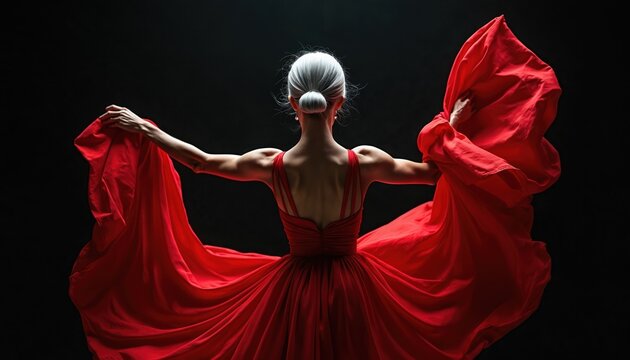 Senior ballerina performs with flowing red gown in dramatic studio lighting. Dancer embodies grace and fluidity during captivating dance movement. Intense backlighting highlights fabrics dynamic flow.