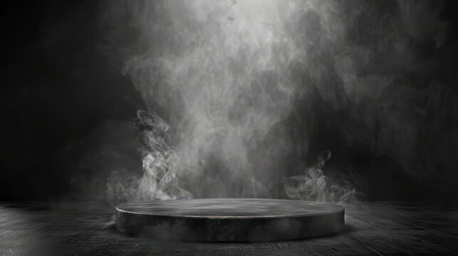 Podium black dark smoke background product platform abstract stage texture fog spotlight. Dark black floor podium dramatic empty night room table concrete wall scene place display studio smoky dust