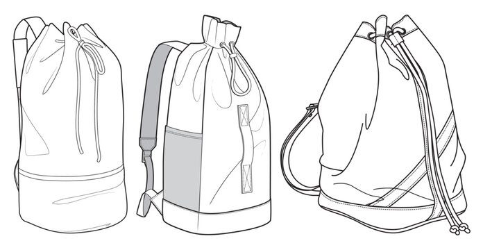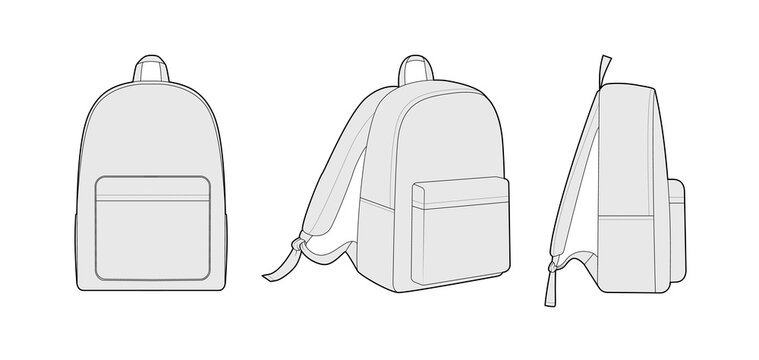 Backpack silhouette bag. Fashion accessory technical illustration. Vector schoolbag front, side 3-4 view for Men, women, unisex style, flat handbag CAD mockup sketch outline isolated
