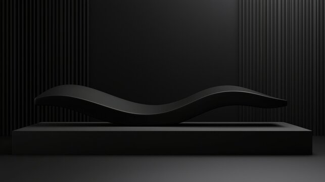 A black, modern chair with a curved backrest and seat sits on a black platform against a black wall.